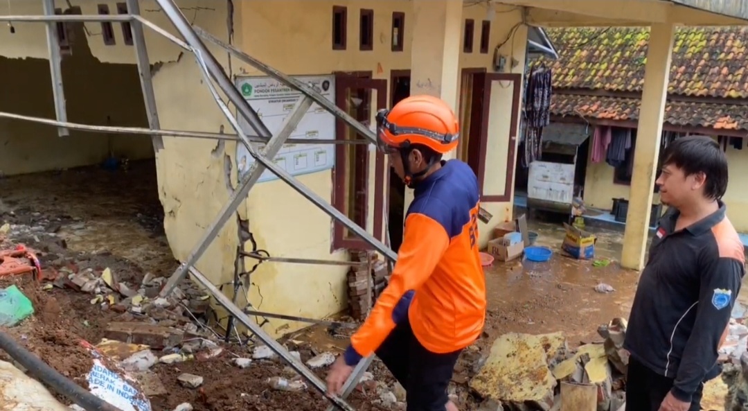 PANDEGLANG, INST-Media.id – Hujan deras yang mengguyur wilayah Pandeglang, Banten membuat warga panik. Tembok penahan tanah (TPT) sepanjang 12 meter dengan tinggi 3 meter ambruk dan menghantam dinding Majlis Pondok Pesantren Riyadul Mubtadiin di Kampung Cidahu Nyomplong, Desa Tanagara, Kecamatan Cadasari, Pandeglang, Banten. Akibatnya, dinding majlis jebol dan rusak parah.