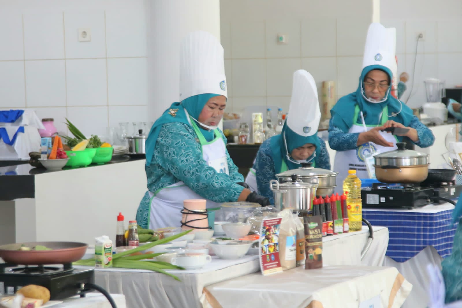 Perwakilan kontingen TP PKK Provinsi Banten perlombaan memasak menu pangan lokal diantaranya Wulan Priatningsih, Anggi wahyuni dan penanggungjawab Iis Nurhayati.