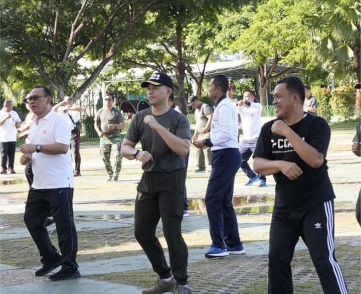 Cilegon, iNst Media – Wali Kota Cilegon Helldy Agustian bersama Wakil Wali Kota Cilegon Sanuji Pentamarta ikut serta Olahraga Bersama dengan POLRES, KODIM 0623/Cilegon, dan KPU dalam rangka menjelang pelaksanaan Pemilihan Umum (Pemilu) 2024. Olahraga ini digelar di Alun-alun Kota Cilegon pada Jumat, 02 Februari 2024.