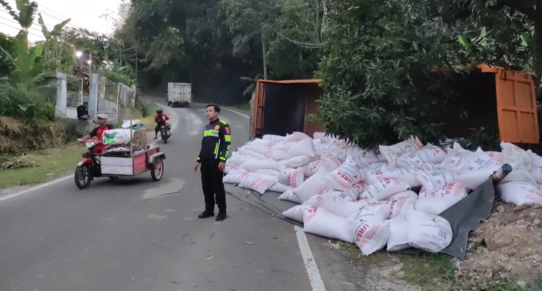 PANDEGLANG, INST-Media.id – Sebuah truk bermuatan pupuk terguling di Jalur Lintas Timur Pandeglang, tepatnya di Kampung Lebak Seureuh, Kelurahan Kadu Merak, Kecamatan Karang Tanjung, Kamis (9/10/2025) petang. Diduga, truk tersebut tidak kuat menanjak hingga kehilangan kendali, menyebabkan kecelakaan tunggal.