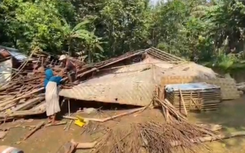 “Sudah lama miring, sempat kami sanggah pakai bambu. Tapi malam itu sekitar jam tiga roboh total. Sekarang Bu Saniti dan Pak Juned ngungsi di rumah saya,” kata Erawati.